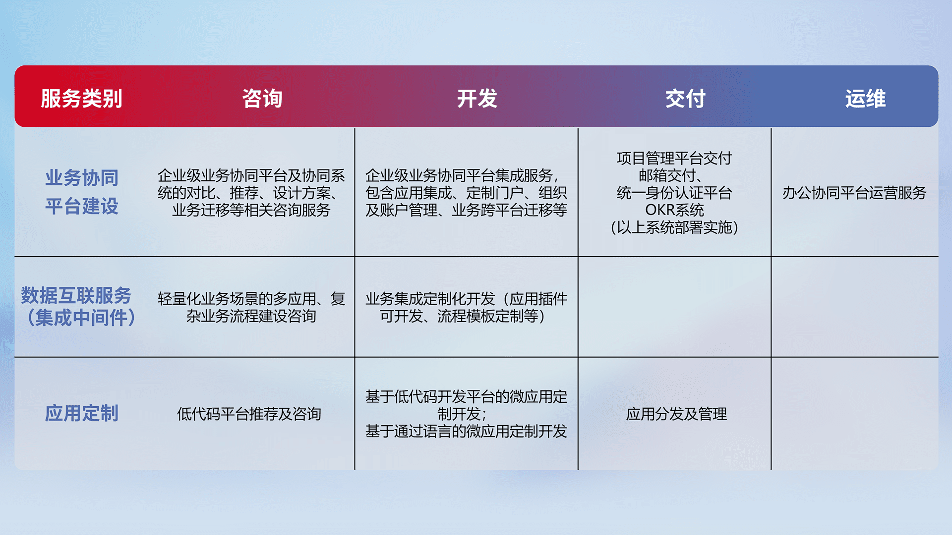 针对钉钉、、企微、、IDaas等平台级产品提供产品的规划、、方案、、、交付、、、定制化开发等服务,,实现如统一协同办公、、智能客户服务、、、混合会议管理、、智能数据查询、、、、等业务场景,,,,实现数字化转型。。